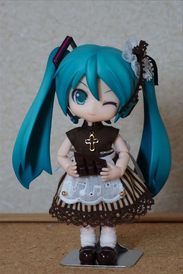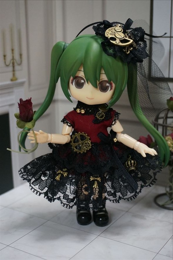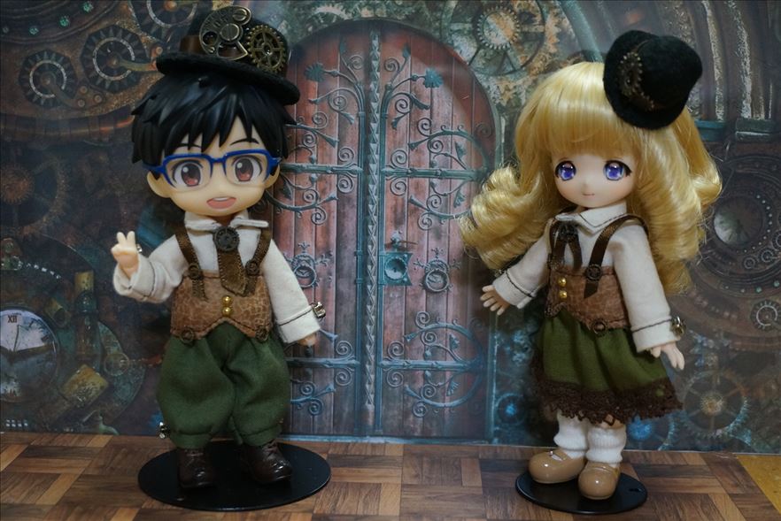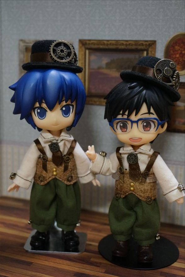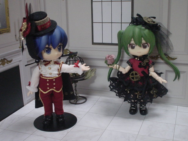 先月のI・DOLLで購入したマミンカーミニさん作の超かっこいい!!11cm男の子用のドレスセットを着るオビツロイドのKAITO兄さんと自作ドレス(歯車姫)のミクさん。